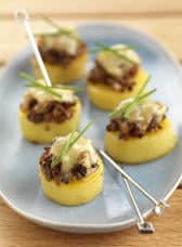 Répartir un peu de champignons sur chaque morceau de pomme de terre puis mettre un morceau de comté sur chaque canapé. Les disposer sur une plaque puis les mettre à gratiner 5 minutes au four préchauffé thermostat 7. Servir aussitôt.
