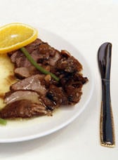 Avant de servir, découper le canard, dresser dans un plat de présentation et entourer les morceaux de volaille de riz nature.