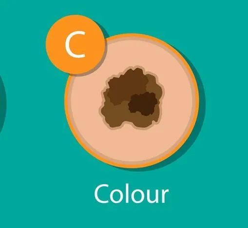 Une couleur va être suspecte si elle est inégale, si elle implique des nuances de noir, blanc, gris, marron ou rose. Deux couleurs ou plus est aussi révélateur d'une lésion suspecte.