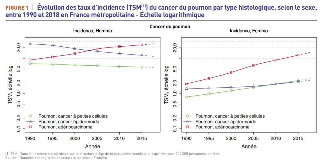 Cette étude montre aussi que les femmes sont de plus en plus victimes du cancer du poumon. Son incidence augmente de 5,3 % par an, et sa mortalité de 3,5 % par an chez la population féminine. Des chiffres qui peuvent s’expliquer par l’augmentation du tabagisme sur la période observée.