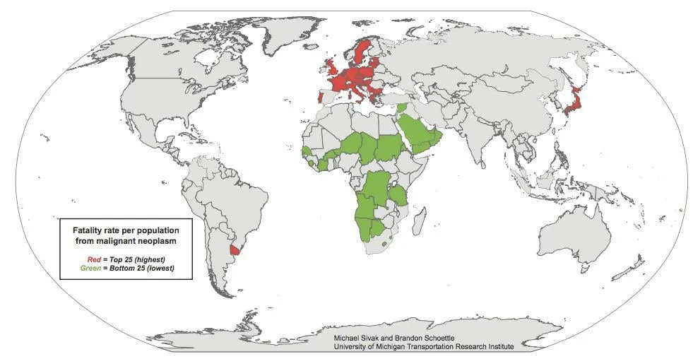 Grâce à leurs recherches, ils ont pu mettre au point une carte des pays où le cancer était le plus meurtrier. Et ont pu observer que les pays développés sont ceux où l’on décède le plus de tumeurs. 23 des 25 pays où la mortalité est la plus élevée se trouvent en Europe. Les pays africains, qui connaissent le plus d’accidents mortels sur les routes pour 100 000 habitants, affichent eux les taux de mortalité des suites d’un cancer les plus bas.