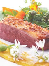 Canette rôtie, griesknepfles aux boutons d'ail des ours