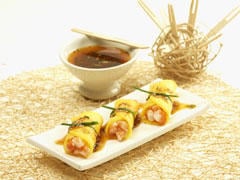 A l'intérieur de chacune, déposer quelques morceaux de crevette. Replier la mangue pour façonner les cannelloni, les maintenir fermer avec un cure-dent.