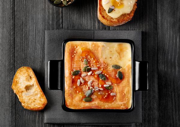 - Entailler la croûte du fromage en plusieurs endroits, saupoudrer d’un peu de cumin et ajouter une cuillère à soupe de miel.