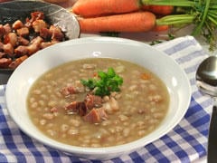 Ficeler la couenne de porc. La porter à ébullition dans une marmitte avec la poitrine de porc et la saucisse à l'ail, dans 5 litres d'eau.