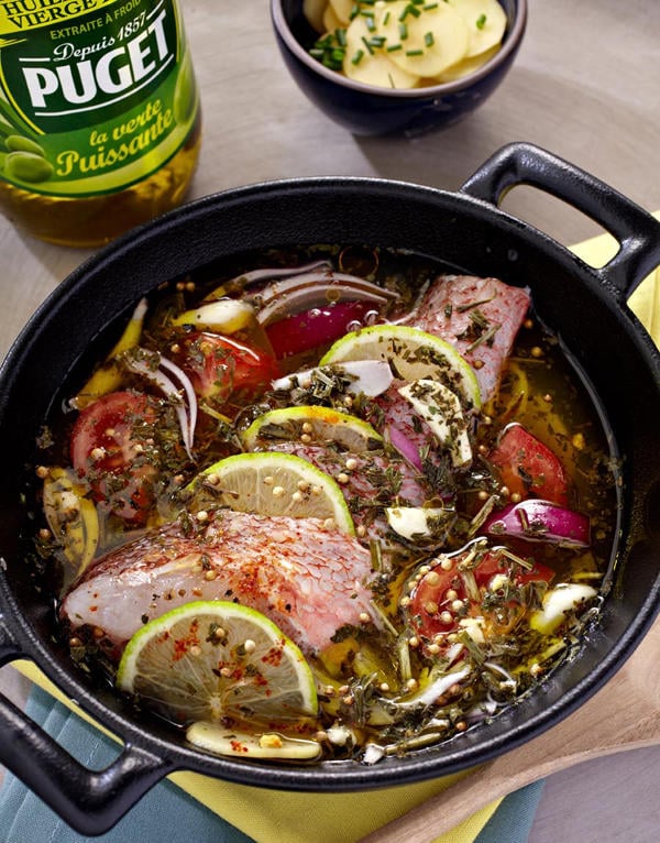 Pendant ce temps, ôtez la peau des pommes de terre et accommodez-les en salade, avec un généreux filet d’Huile d’olive Puget la verte puissante, une pointe de vinaigre de xérès, les oignons blancs et leur tige émincés.