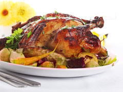 Sortez le chapon du four, découpez-le et servez la sauce dégraissée et la farce à part.
