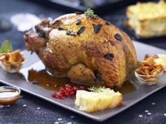 Récupérez le jus. Dégraissez-le et faites-le réduire si nécessaire. Découpez le chapon, servez avec la farce aux truffes et la sauce dégraissée à part. Accompagnez d’une purée de pommes de terre et de marrons poêlés.
