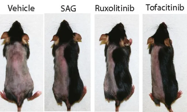Traitées pendant 5 jours avec des inhibiteurs de JAK (ruxolitinib et tofactinib), des souris ont vu leurs poils repousser dans les 10 jours, contrairement aux souris non-traitées. Le même résultat a été constaté sur des follicules de cheveux humains greffés sur des souris.