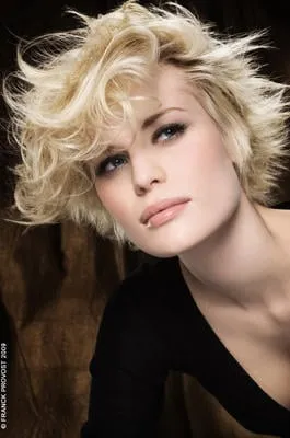 Image affirmée, cette coupe courte, déstructurée, couleur platine ne fait pas dans la demi mesure. Effilée sur les pointes, elle offre une grande flexibilité de coiffages.