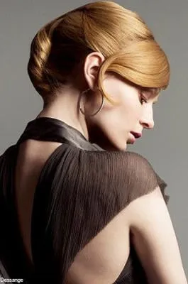 Un simple carré peut se transformer en un chignon ultra sexy. Une mèche est parfaitement lissée et laquée sur un côté du visage, tandis que l'ensemble de la chevelure est enroulé pour créer l'effet "chignon banane", bombé sur le dessus et fixé sur les côtés à l'aide d'épingles.