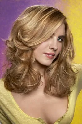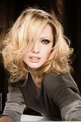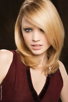 Le brushing de cette coupe effilée est travaillé tout en souplesse et les boucles modelées au fer à friser sur toute la longueur des cheveux. Un coiffage élégant qui met en relief des mèches blondes dorées.