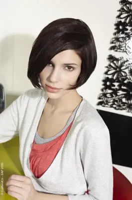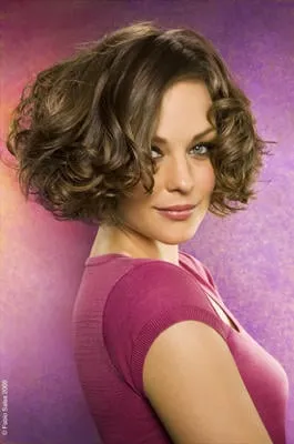 Une coupe rectangle qui suit la forme du visage. La mèche de devant permet un coiffage bouclé. Sur cheveux humides, on applique de la mousse de coiffage, puis on travaille les boucles au fer à friser.