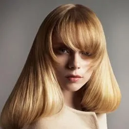 Un carré à frange droite légèrement ondulé sur les pointes, pour une allure ultra glamour. Cette coupe est mise en valeur par un blond platine éblouissant.