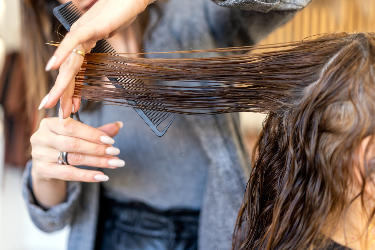 close up of a hairdressers hands cutting wet hair in a hair salon