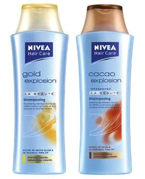 Nivea continue son aventure capillaire en lançant une gamme sublimatrice de couleur dans laquelle deux shampoings sont proposés : Cacao Explosion et Gold Explosion. Le premier à base de Cacao et de châtaigne, le second à base de germe de blé et de tournesol promettent tous les deux de jolis reflets, une protection UV et une douceur incomparable.