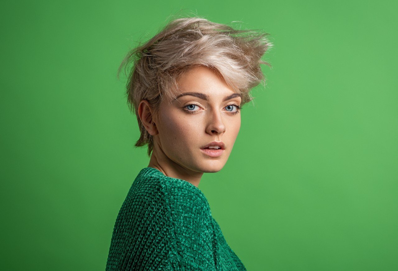 La coupe asymétrique met en valeur la beauté du cou ainsi que les traits fins.