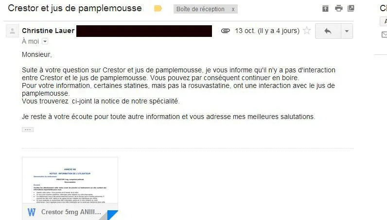 Nous avons interrogé par mail le laboratoire AstraZeneca qui fabrique le Crestor®. Selon eux, aucune inquiétude à avoir : "Je vous informe qu'il n'y a pas d'interaction entre Crestor® et le jus de pamplemousse. Vous pouvez par conséquent continuer en boire. Pour votre information, certaines statines, mais pas la rosuvastatine ont une interaction avec le jus de pamplemousse" a répondu Christine Lauer, responsable du service clients du laboratoire.