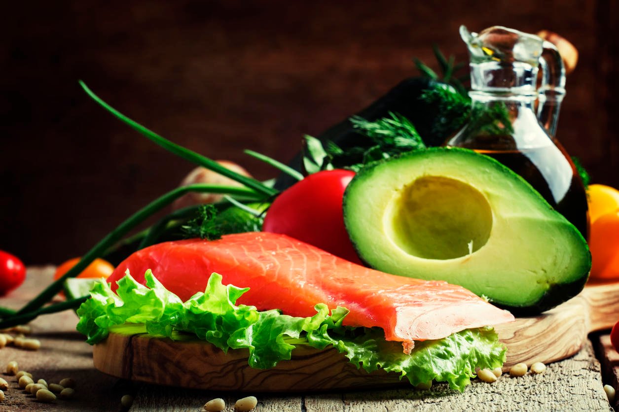ingredients for salad with smoked salmon and avocado, foods are high in healthy fats vintage wooden background, selective focus