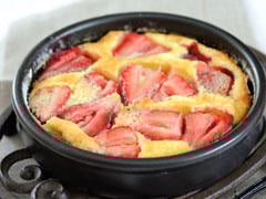 Rouler rapidement les fraises, préalablement lavées, équeutées et coupées en 2, dans un peu de farine puis les déposer dans un plat bien beurré.