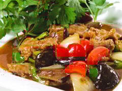 9. Ajouter les poireaux, mélanger puis joindre les poivrons, mélanger, continuer avec la laitue et mélanger. Verser les abricots secs, l'ail, le gingembre, le fond de sauce et l'eau dans le wok et vous mélangez. Verser la crème et porter à ébullition, puis à feu doux. Ajouter la sauce soja, le curry et saler un peu. Goûter, rectifier l'assaisonnement, arrêter la cuisson dès que les légumes sont encore croquants.