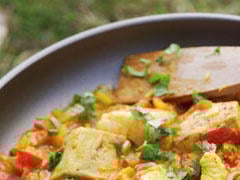 Faire revenir la poudre à colombo avec les ingrédients (tomate, oignon, persil, cives, thym, sel) à feu doux pendant 10 minutes.