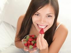 portrait, femme, manger, fraises, sain, heureux, heureux, femme, manger, fraise, intérieur, lit, tenue, bol, fraises, magnifique, sourire, mélangé, caucasien, asiatique, femme, modèle
