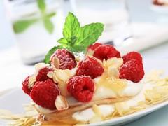 Ingrédients pour 4 personnes : 6 œufs, 75 g de sucre semoule, 125 g de poudre de lait écrémé, 5 g de poudre à lever, édulcorant, 1 litre de lait demi-écrémé, 150 g de poudre à flan, 500 g de fromage blanc 0 % de matière grasse, 10 jaunes d’œufs, 10 feuilles de gélatine, édulcorant, 2 barquettes de framboises.
