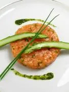 Ingrédients pour 4 personnes : 400 g de saumon frais haché, 1 cuillère à soupe d’échalote ciselée, 1 cuillère à soupe de cornichon haché, 1 cuillère à soupe de câpres hachées, 4 cuillères à soupe d’herbes hachées (ciboulette, cerfeuil, persil), 1 jaune d’œuf, 1 cuillère à soupe de moutarde de Dijon, huile d’olive, tabasco, sauce anglais, sel, poivre blanc.