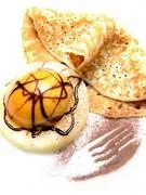 Ingrédients pour 4 personnes : 4 crêpes, 4 pêches, 100 g de sucre, 100 g de beurre, 2 cl de jus d’orange, marasquin.