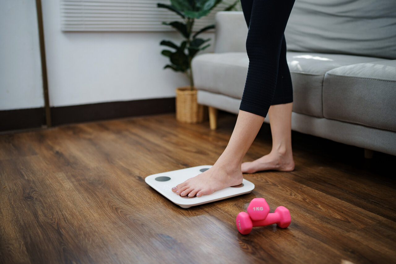 woman leg stepping on scales at home measurement instrument in kilogram for diet lose weight concept