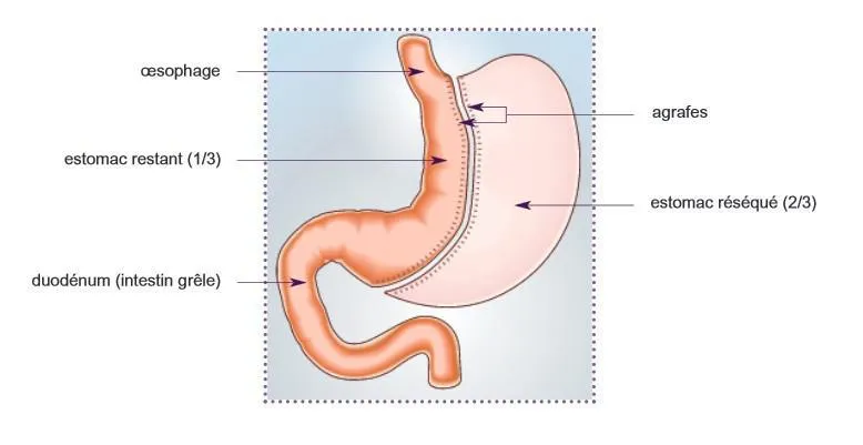 Son principe : la sleeve est une technique restrictive et "hormonale" qui consiste à couper les deux tiers de l’estomac, le réuisant à un tube vertical. La partie retirée est celle qui contient les cellules qui sécrètent l’hormone stimulant l’appétit (ghréline). L’estomac est réduit à un tube vertical, les aliments passent rapidement dans l’intestin.
