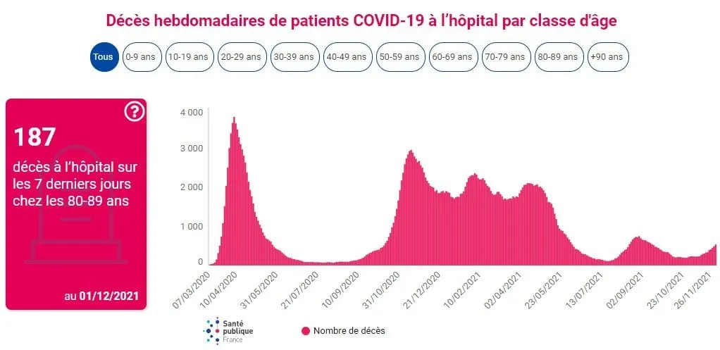 Au 1ᵉʳ décembre 2021, soit mercredi dernier, le nombre de décès enregistrés à l’hôpital en France s’élevait à 520, soit un taux de mortalité de 22,1 pour 100 000 habitants. Début mars 2020, en plein pic de la première vague, on comptait jusqu’à 3700 morts par jour, tandis qu’au plus fort de la seconde vague, nous étions à plus de 2900 décès quotidiens.