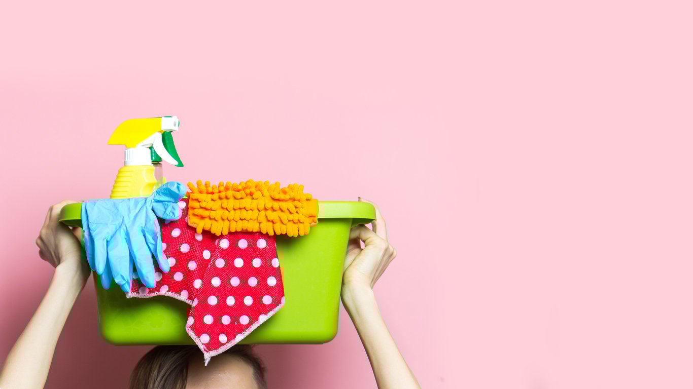 woman with house supplies ready to to clean room spring cleaning, minimal style