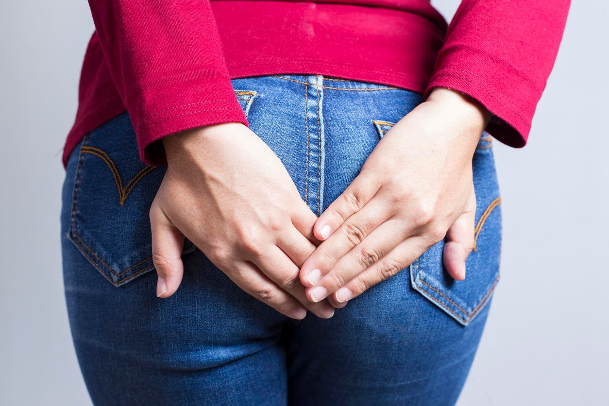 femme a la diarrhée tenant ses fesses isolé sur fond blanc