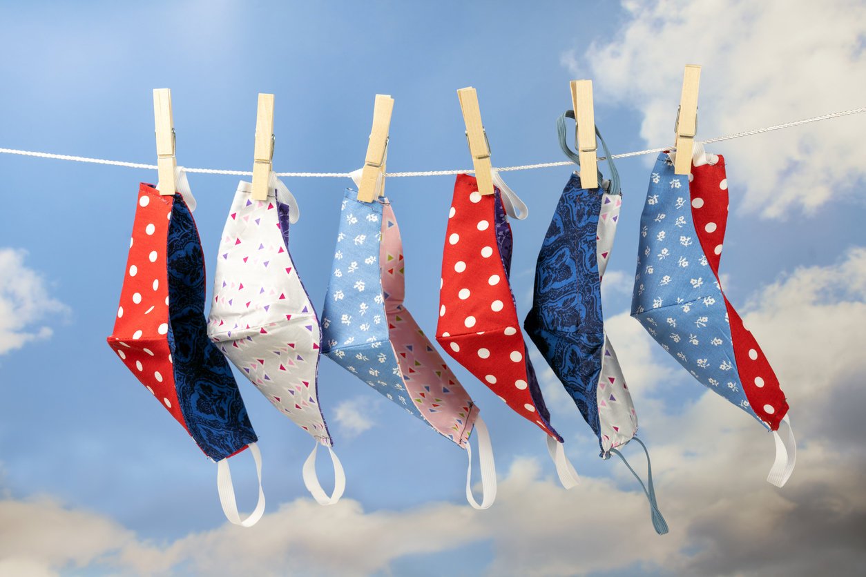 colorful homemade community face masks for protection from coronavirus pandemic are hanging on a clothesline against a blue sky with clouds, selected focus