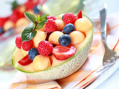2. Éplucher le melon, retirer les graines et le couper en lamelles. Plonger ces lamelles dans le sirop frémissant pendant 5 min.
