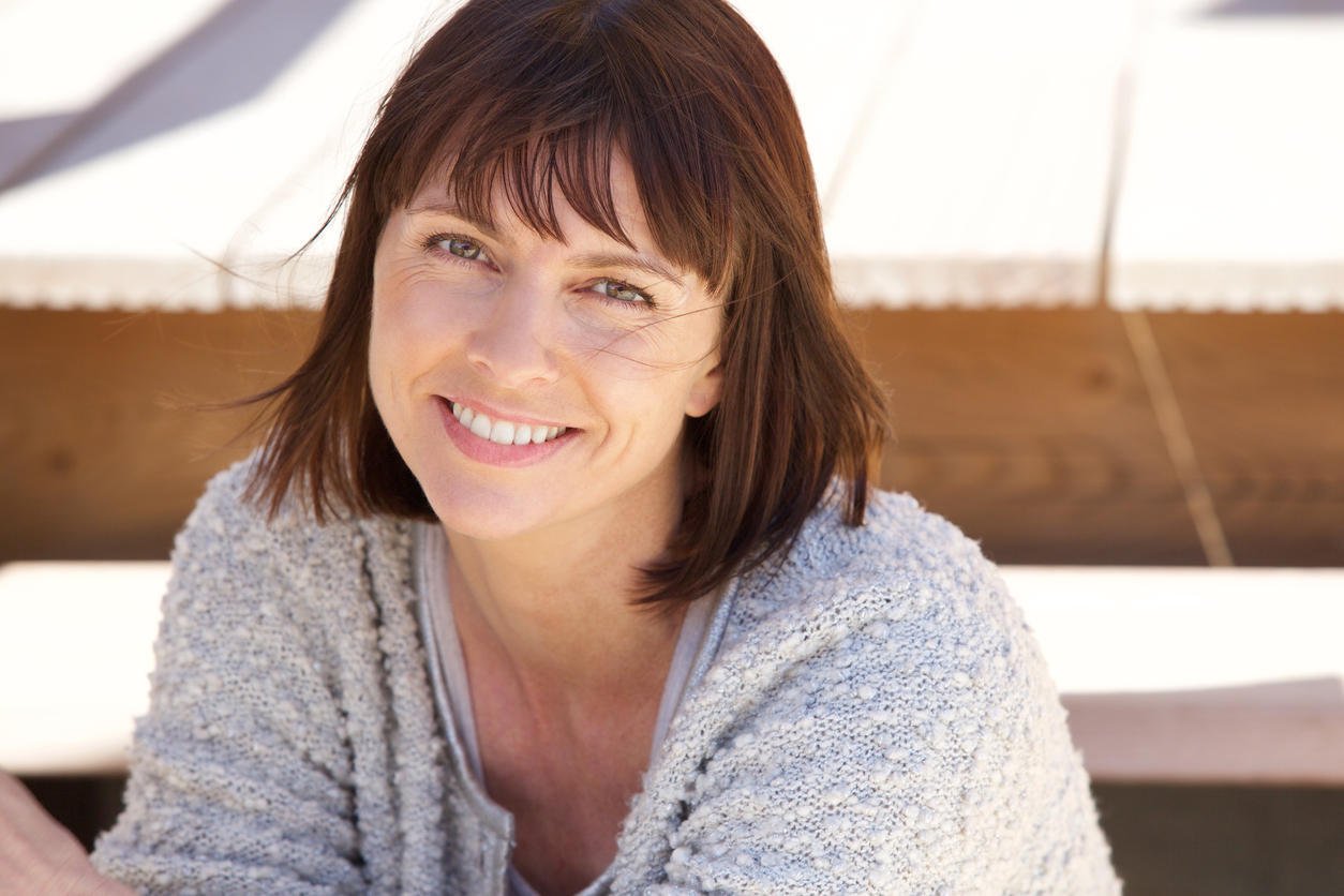 bouchent le portrait d'une femme âgée en bonne santé, souriant à l'extérieur