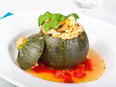 7. Remplir les moitiés de courgettes avec la farce et les disposer dans un plat allant au four.