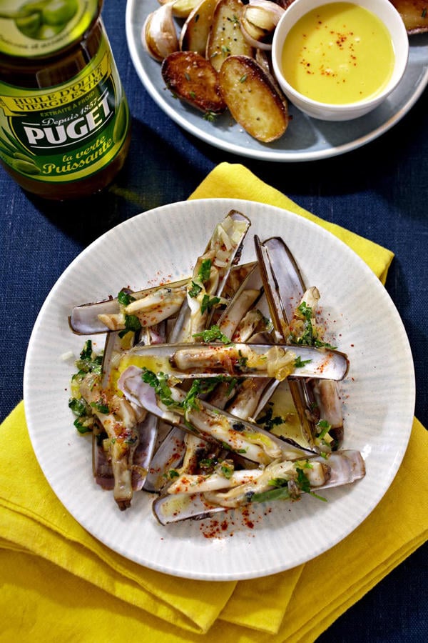 Dans une grande poêle antiadhésive chaude, versez 3 cuillères à soupe d’huile d’olive Puget classique. Ajoutez les couteaux et faites-les sauter à feu vif 5 minutes. Otez et réservez le jus de cuisson, puis prolongez la cuisson d’environ 3 à 4 minutes en ajoutant échalote, ail et persil.
