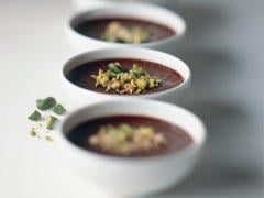 Au moment de servir, répartir le mélange tiède à base de pistaches sur les crèmes froides.