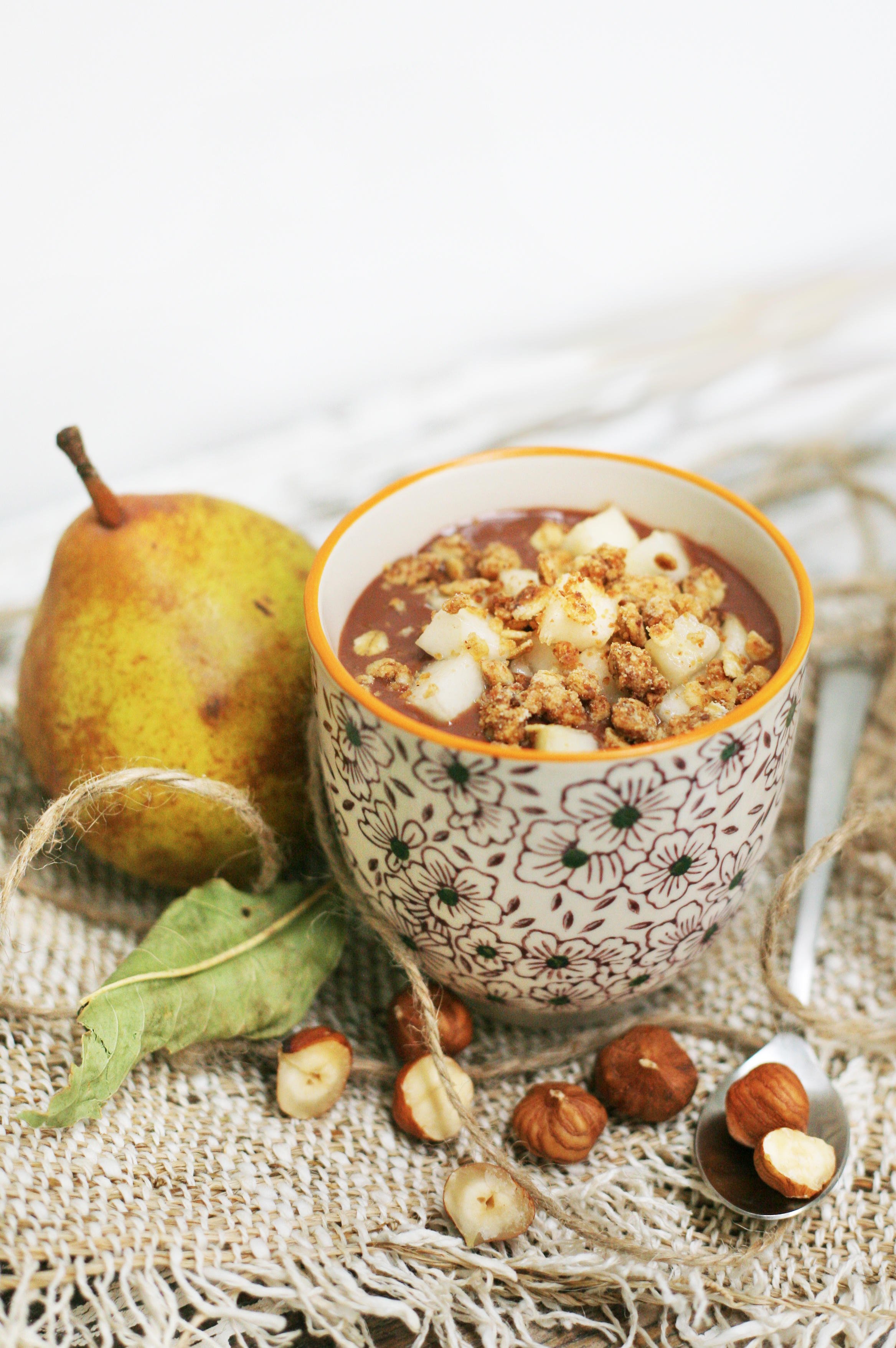 Crème chocolatée végétale, noisettes, poire et crumble au sirop d'érable