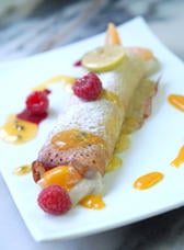 Présentation du dessert : rouler une crêpe de taille moyenne avec de la crème pâtissière légère et y faire tomber de jolis morceaux de fruits frais; déposer quelques gouttes de coulis de mangue et de framboise ou de fruit de la passion et de fruits frais pour décorer.