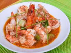 9. Dans la poêle, ajouter le citron, saler. Mélanger. Cuire 2 min. Placer dans un plat de service, décorer avec les crevettes et les pousses de bambou.