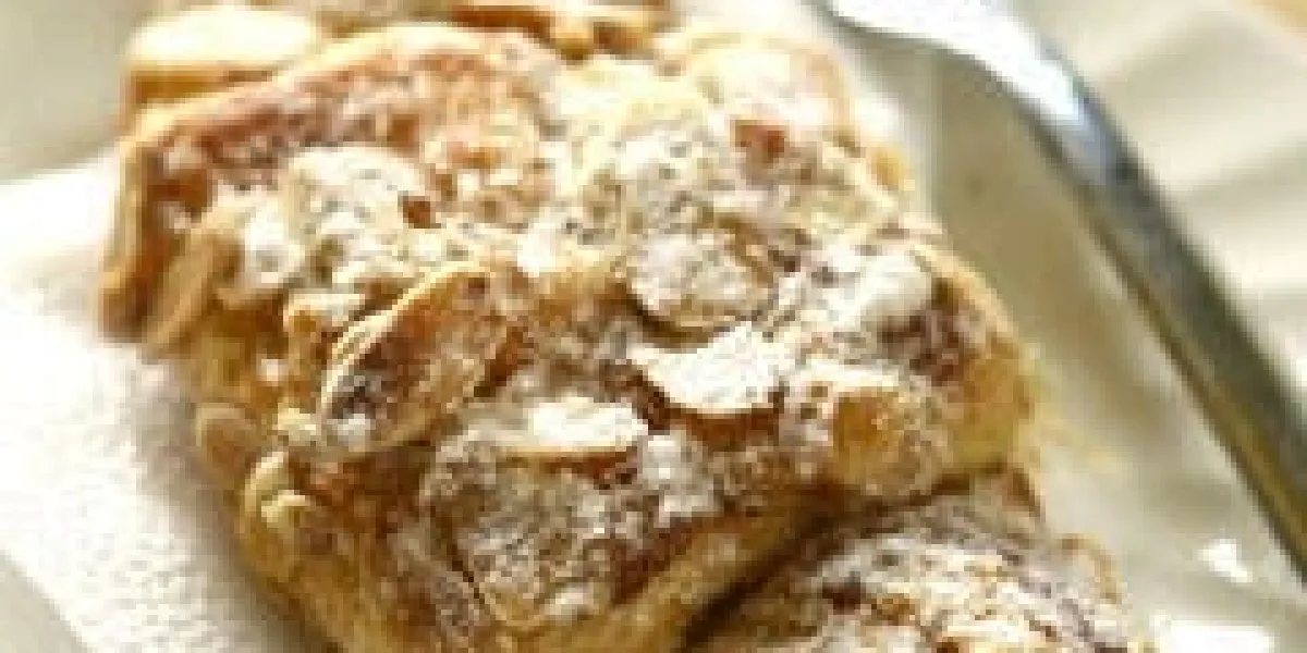 Façonner les croissants et les recouvrir de crème. Les parsemer d'amandes avant de les enfourner 20 minutes.