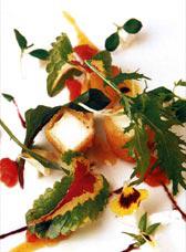 400 g de fromage de Mahon, 1 jaune d'oeuf, 80 g de marmelade d'oranges, 150 g de chapelure, mesclun et pétales de pensées.