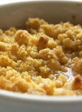 Pour préparer les miettes de crumble, couper 160 g de beurre en petit morceaux et le mélanger grossièrement à la farine, le sucre et le nougat en miettes. Saupoudrer la pâte de crumble sur les fruits. Mettre au four 10 minutes à 210 °C