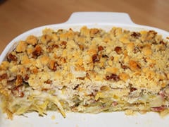 Dans un plat à gratin, disposer les poireaux. Recouvrir de la pâte à crumble.