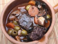 1- La veille : couper la viande en cubes, les placer dans une terrine. Ajouter le vin, le laurier, le thym, une gousse d’ail pelée et écrasée, les clous de girofle, 1 oignon pelé et coupé en rondelles, le jus et le zeste de l’orange. Couvrir et laisser mariner 12 heures au frais.