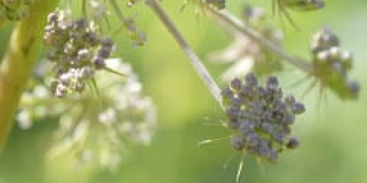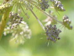 Cette plante herbacée peut mesurer 2 mètres de haut. Sa tige est cannelée, violette et ses feuilles sont grandes et dentées. Elle donne de petites fleurs jaunes en ombelles et des fruits ovales et brun.